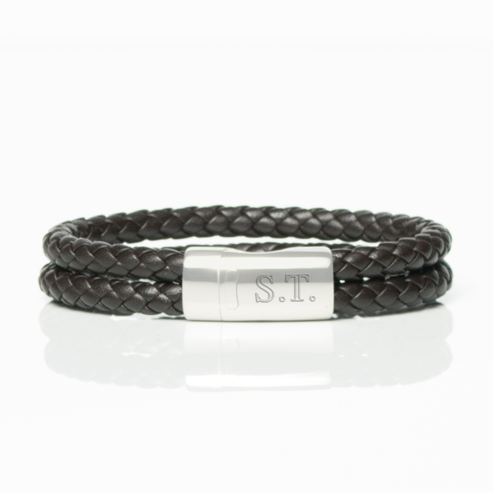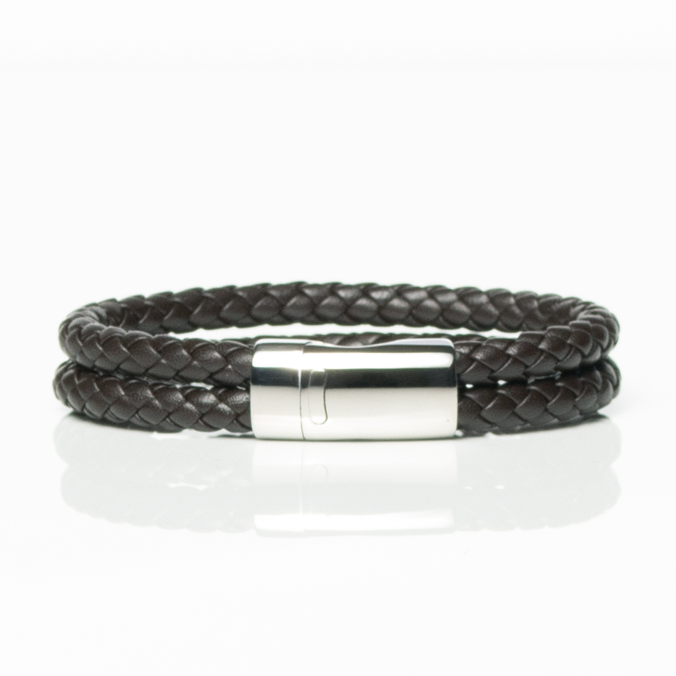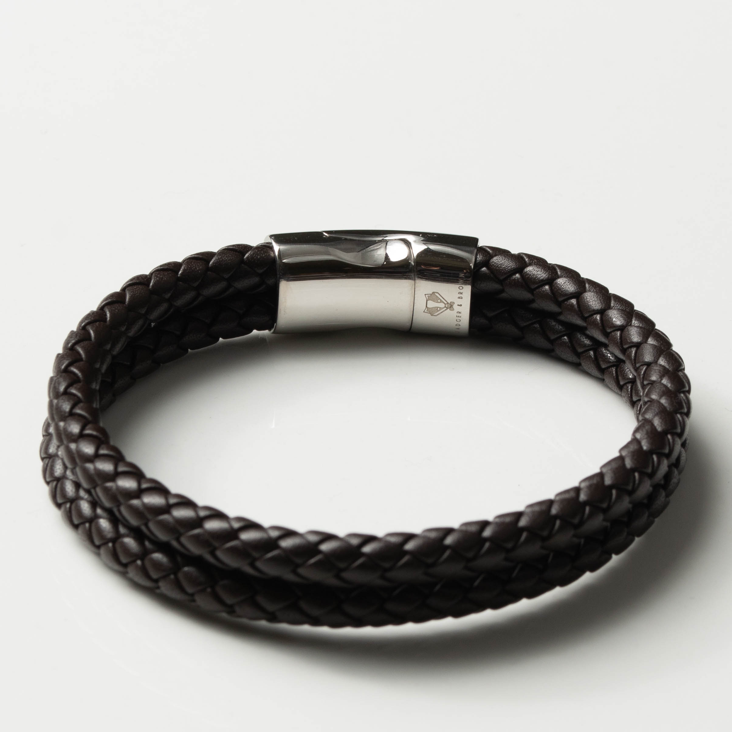 Brown Leather Double Braided Bracelet. Top grain cow leather featuring a durable stainless steel clasp for a secure fit. Each bracelet combines classic craftsmanship with modern design, making it the perfect accessory for any occasion. Available in various colors, these bracelets add a touch of sophistication to your everyday look.