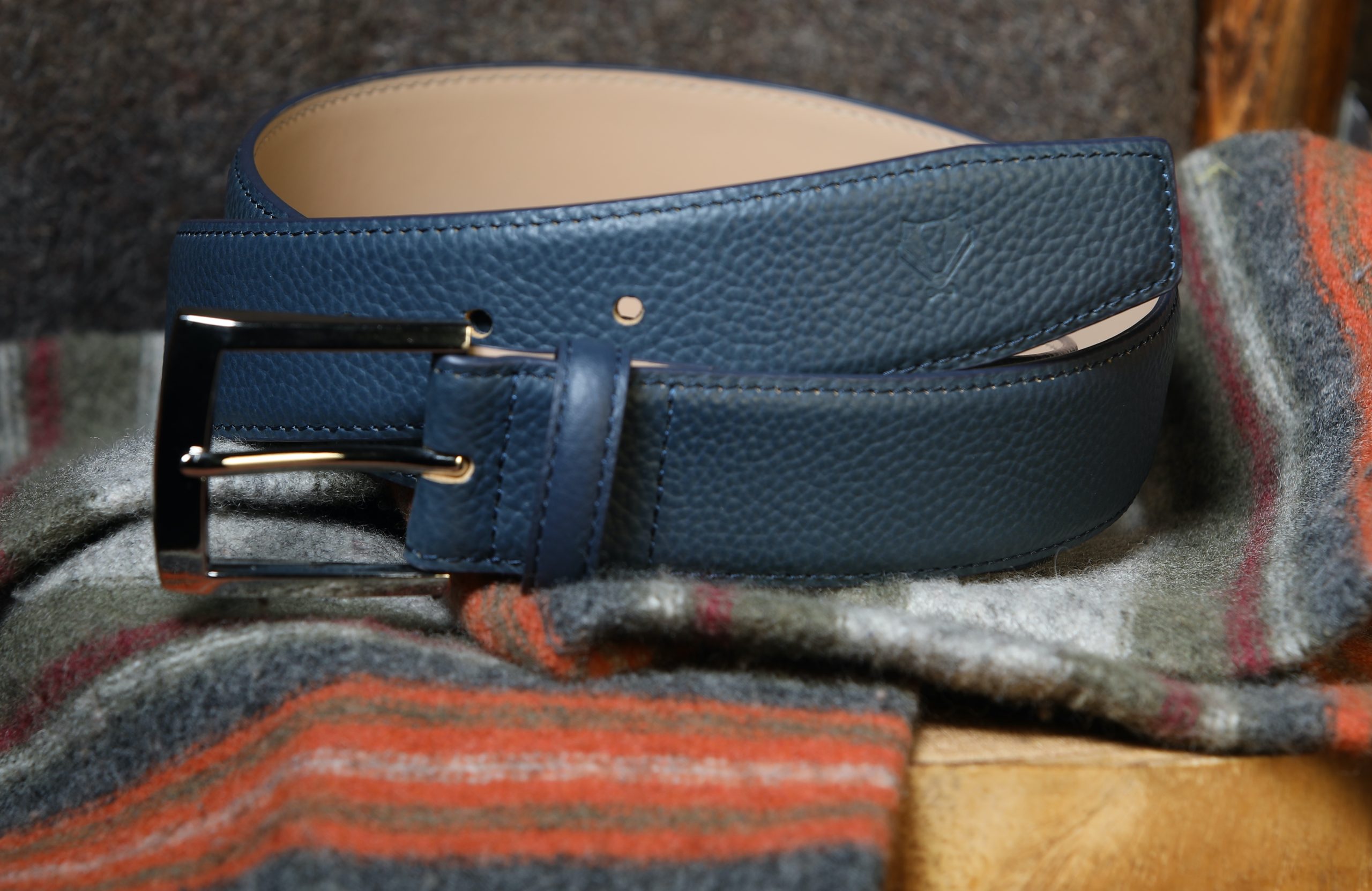 Grain Textured Navy Leather Belt. This belt exemplifies the perfect fusion of elegance and durability, and offers a timeless design that complements any wardrobe. With attention to every detail, the belt combines tasteful style with lasting quality, providing a sophisticated and comfortable fit. It’s the ultimate accessory for those who appreciate the subtleties of luxury.