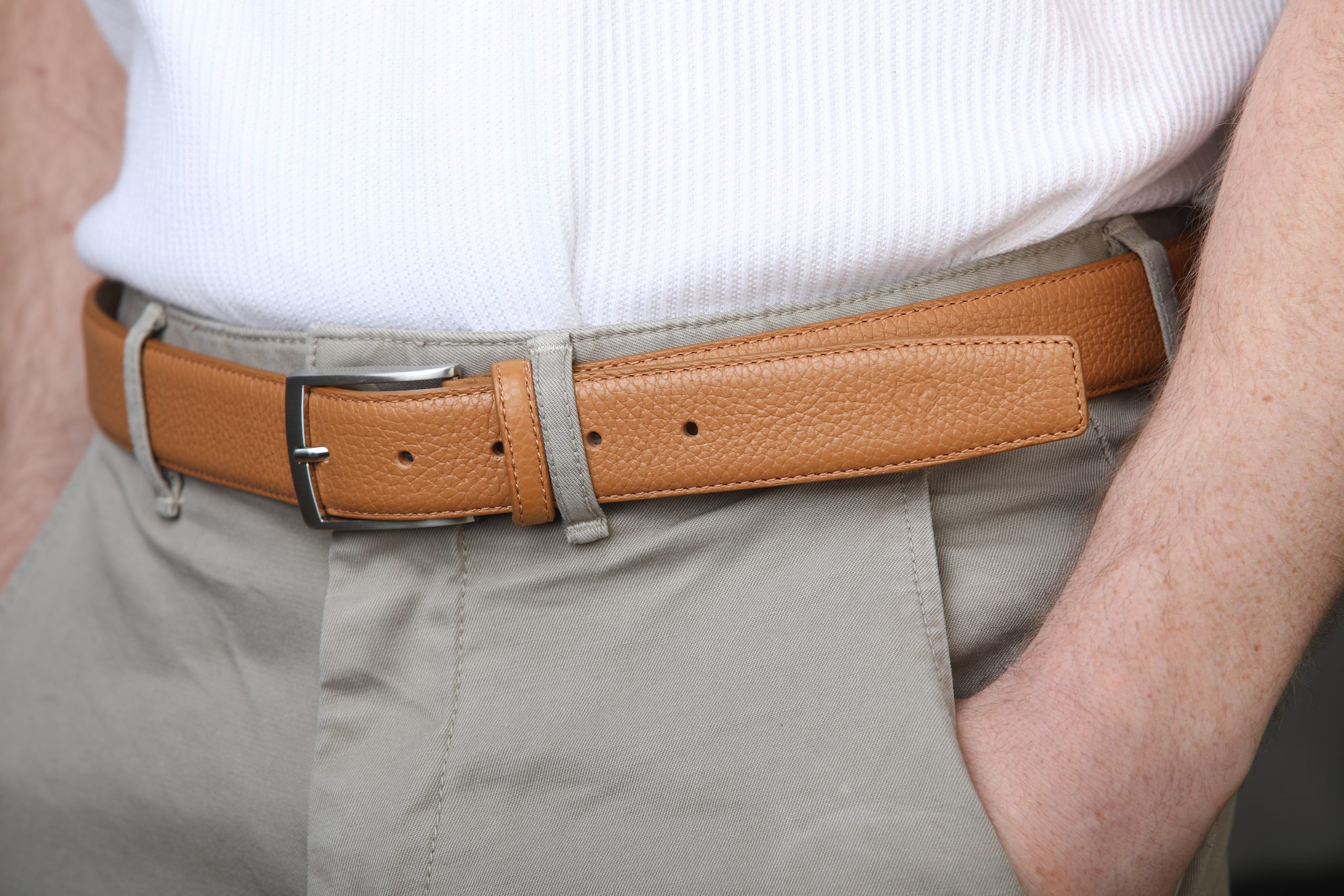 Grain Textured Tan Brown Leather Belt. This belt exemplifies the perfect fusion of elegance and durability, and offers a timeless design that complements any wardrobe. With attention to every detail, the belt combines tasteful style with lasting quality, providing a sophisticated and comfortable fit. It’s the ultimate accessory for those who appreciate the subtleties of luxury.