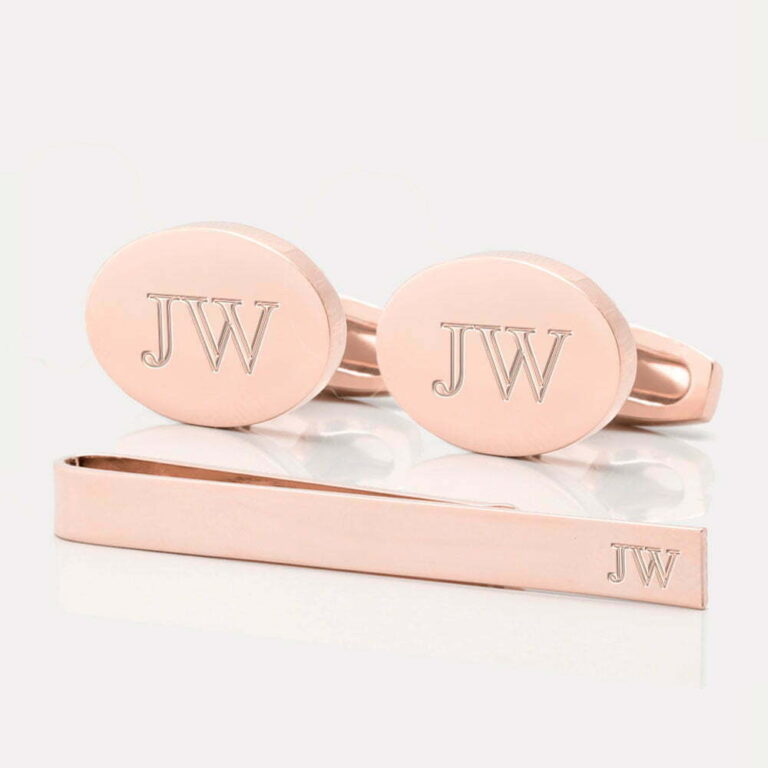 Initial Engraved Rose Gold Plated Tie Slide & Cufflinks Set adds a luxurious and personalised touch to any attire. Handcrafted to a high quality, available in rectangle, oval. hexagon or bar shaped cufflinks they make the perfect gift for someone to cherish and wear for special occasions. Please select a cufflink shape and tie slide size and enter your initials and our expert team will take care of the rest.