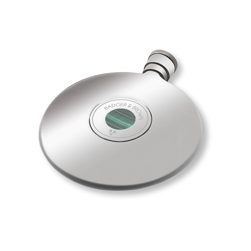 Luxury Compact Hipflask With Malachite Stone. An elegant & understated design that we’ve handcrafted to a very high standard. A product that will last the length of time and can be cherished as a personal gift.