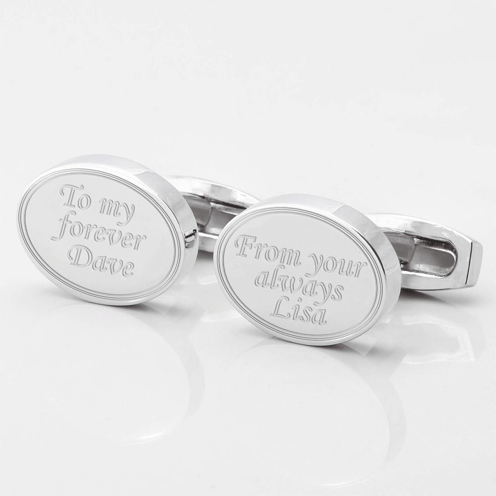 You can personalise this product by engraving the clasp (as seen in the product gallery) and we can engrave 20 characters per cufflink. In addition to this, we offer an engraved gift box that you can present the cufflinks in, with a message of 120 characters. A gift wrapping service is available too.