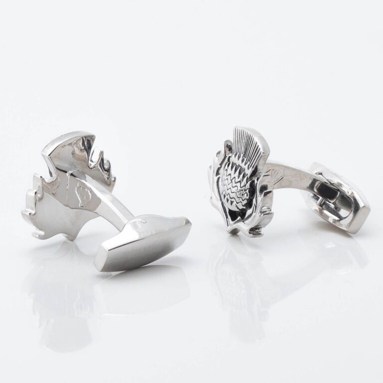Scottish thistle cufflinks. Perfect for the true Scot and a great design to personalise. These solid cufflinks are handcrafted to a very high standard and the design is highly detailed. The Scottish thistle cufflinks are connected to a sturdy stem and our strongest clasp available.