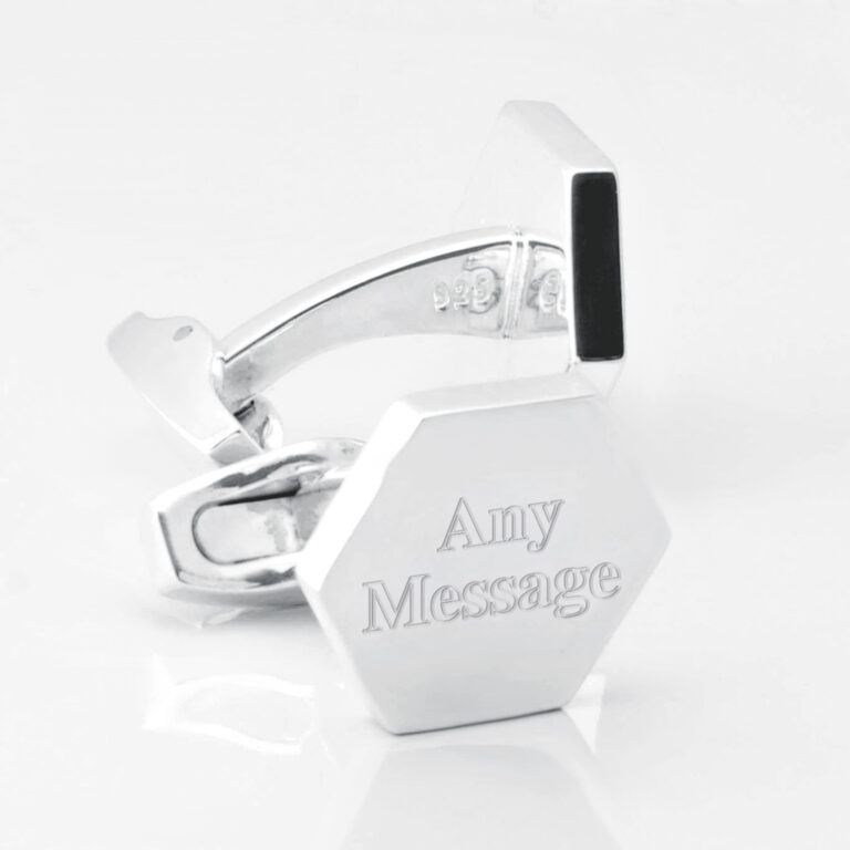 Sterling silver hexagon engraved cufflinks. An elegant & understated design that we’ve handcrafted to a very high standard. A product that will last the length of time. Genuine 925 Sterling Silver that we’ve created in a simplistic hexagon design. A popular shape with our customers.