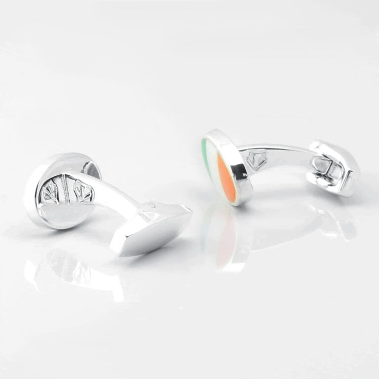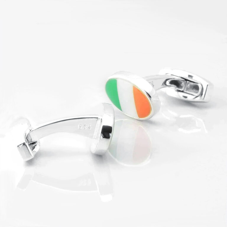 These solid cufflinks are handcrafted to a very high standard and the design is highly detailed. Irish flag cufflinks that are connected to a sturdy stem and our strongest clasp available. A product that will last the length of time and can be cherished as a personal gift. We’ve used high quality silver and and they’re hallmarked.