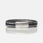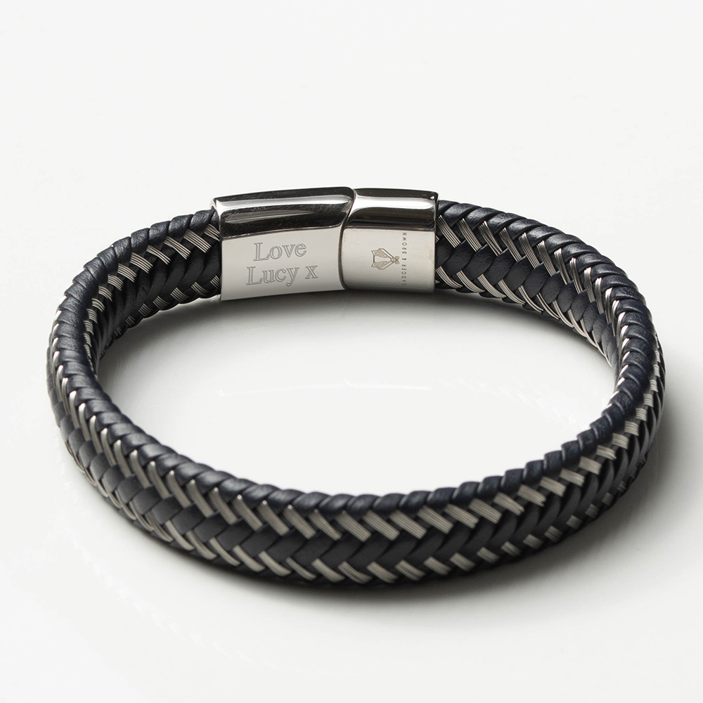 Two-Tone Navy Woven Leather Bracelet. This bracelet exemplifies the perfect fusion of elegance and durability, and offers a timeless design that complements any wardrobe. With attention to every detail, the bracelet combines tasteful style with lasting quality, providing a sophisticated and comfortable fit. It’s the ultimate accessory for those who appreciate the subtleties of luxury.